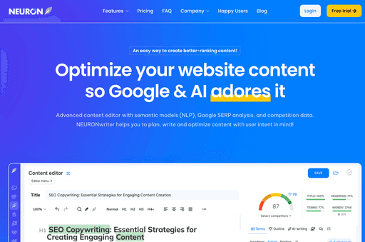 Advanced content editor with semantic models (NLP), Google SERP analysis, and competition data. NEURONwriter helps you to plan, write and optimize content with user intent in mind!